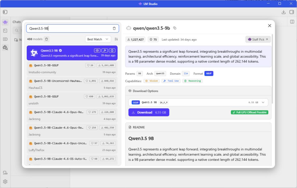 そうするとモデル検索のダイアログが上がってくるので、ここでダイアログ左上の検索ボックスに「Qwen3.5-9B」と入力して、一番上に出てくる「Qwen3.5 9B」を選択し、右側の詳細画面のダウンロードボタンを押すと、モデルのダウンロードが始まります。