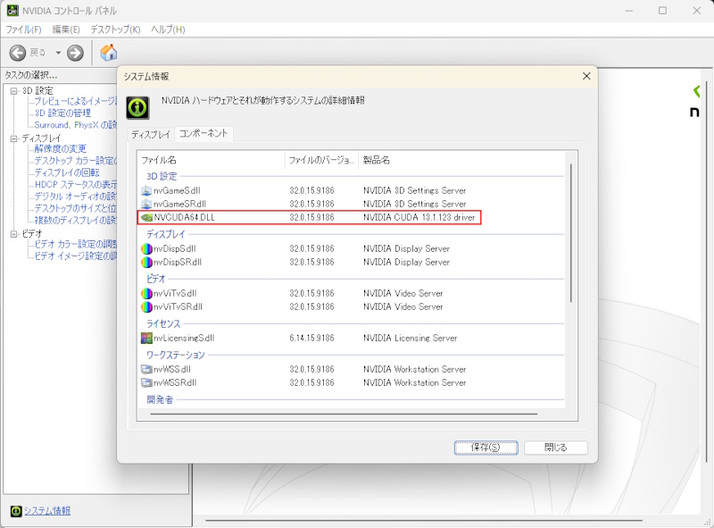すると「システム情報」のダイアログが開きますので、その中にある「コンポーネント」タグにある表の中にある「NVCUDA64.DLL」の製品名の欄に CUDA のバージョンが記載されています。