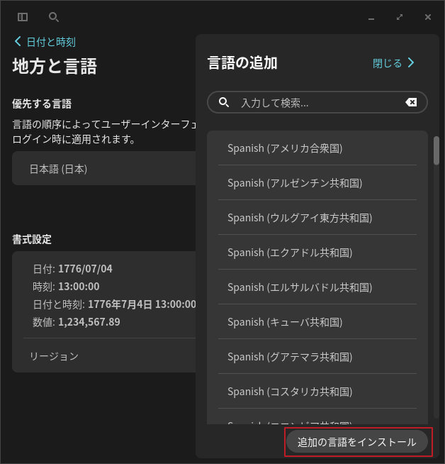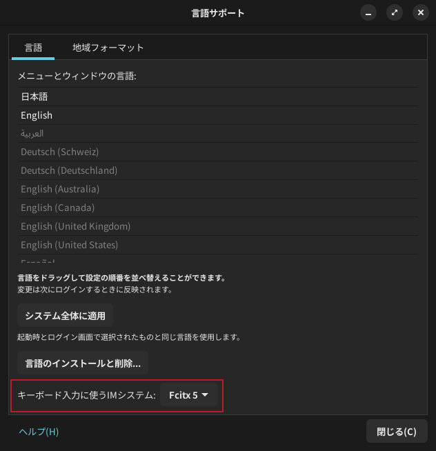 としてから、COSMIC Setting を呼び出して、「日付と言語」から「優先する言語」の「言語の追加」を押下すると出てくるサイドメニュから「追加言語のインストール」を選択すると開く「言語サポート」の「言語」タブから「キーボードに入力に使う IM システム」で「Fcitx」を選択。