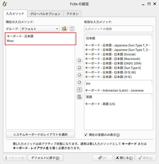 それからアプリケーションとして「 Fcitx5 設定」を起動して、「入力メソッド」タブで入力メソッドとして、「キーボード – 日本語」と「 Mozc 」を加えてください。「キーボード – 英語 (US) 」が入力メソッドとして登録されている場合は、除去してください。